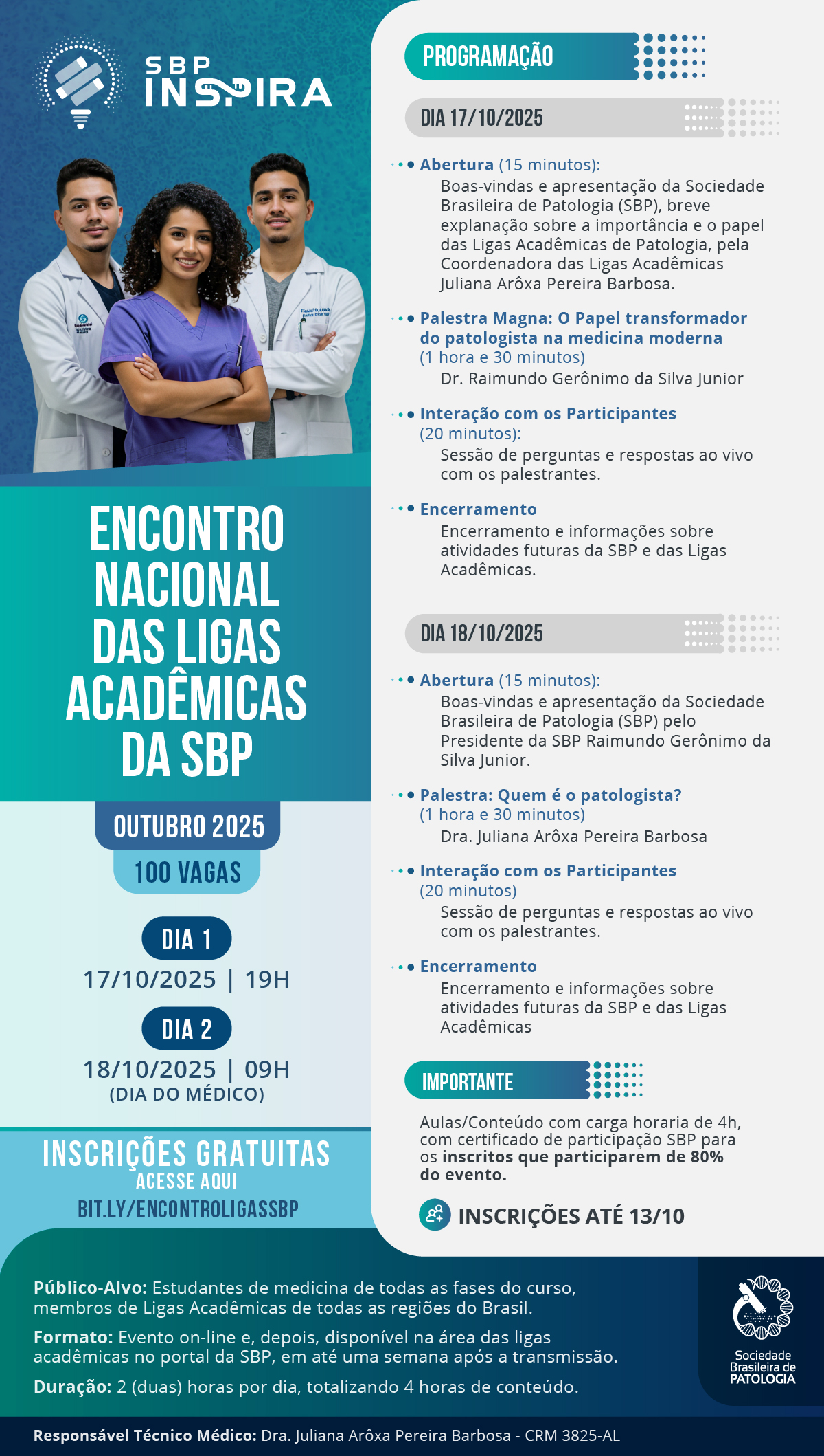 POR Páginainicial REGISTRE LIGA 19/08 Encontro Nacional das Ligas Acadêmicas da SBP Inscreva-se aqui COMPARTILHE Continue lendo 21/11 Projeto SBP Inspira 22/08 Ligas Acadêmicas como ponte entre a universidade e o mundo real: a Patologia que transforma vidas 22/08 A Patologia como Fundamento da Medicina: por que o estudante não pode ignorá-la